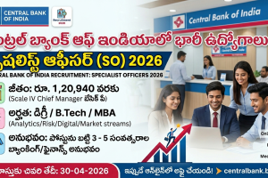 సెంట్రల్ బ్యాంక్ ఆఫ్ ఇండియా (CBI) వివిధ రిస్క్ మేనేజ్మెంట్ విభాగాలలో స్పెషలిస్ట్ ఆఫీసర్ (SO) పోస్టుల భర్తీకి నోటిఫికేషన్ విడుదల చేసింది. అర్హత కలిగిన అభ్యర్థులు ఆన్లైన్ ద్వారా దరఖాస్తు చేసుకోవచ్చు. 📅 ముఖ్యమైన తేదీలు – Central Bank of India Recruitment 2026 ఈవెంట్ తేదీ ఆన్లైన్ దరఖాస్తు ప్రారంభం 09-04-2026 దరఖాస్తుకు చివరి తేదీ 30-04-2026 ఆన్లైన్ పరీక్ష తేదీ (తాత్కాలికం) మే 2026 ఇంటర్వ్యూ తేదీ (తాత్కాలికం) జూన్ 2026…